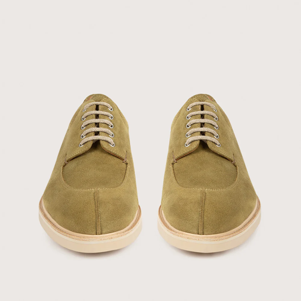 Un derby intemporel qui se distingue par son bout chasse bombé et sa surpiqure au niveau du col. Réalisé dans un cuir de veau velours imperméable, il est monté sur une semelle Hévéa en caoutchouc naturel qui offre un excellent amorti, selon les préceptes du cousu Goodyear.