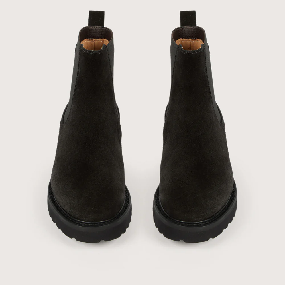Son Ă©lastique dâun seul tenant Ă©pouse harmonieusement la cheville, assurant un chaussant fluide et raffinĂ©. Avec sa semelle au profil affirmĂ© et son allure intemporelle, cette bottine deviendra votre alliĂ©e idĂ©ale pour affronter les saisons avec style, quâil pleuve, quâil neige ou quâil vente.
