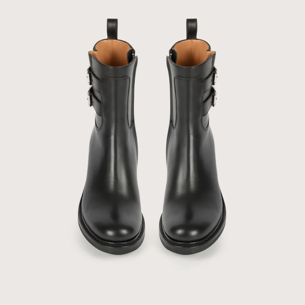 Une bottine féminine à l’allure résolument affirmée. Dotée d’un talon qui élance la silhouette, elle affiche un caractère rock grâce à ses deux boucles, qui offrent également un maintien optimal. Confectionnée selon notre savoir-faire originel en cousu Goodyear, elle garantit un confort durable. Un petit soufflet à la cheville assure une grande aisance au porté et accompagne chaque mouvement. Réalisée en cuir de veau Box, la bottine Joyce revendique une élégance singulière.