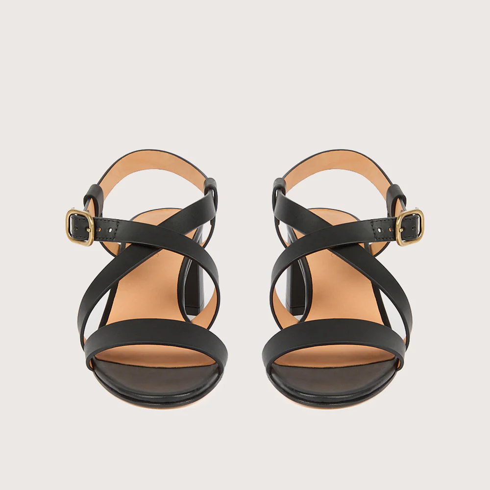 La Sandale à talon Sofia est un modèle de la saison au profil féminin, avec ses brides croisées et sa semelle en cuir. Elle se décline en cuir de vachette noir.