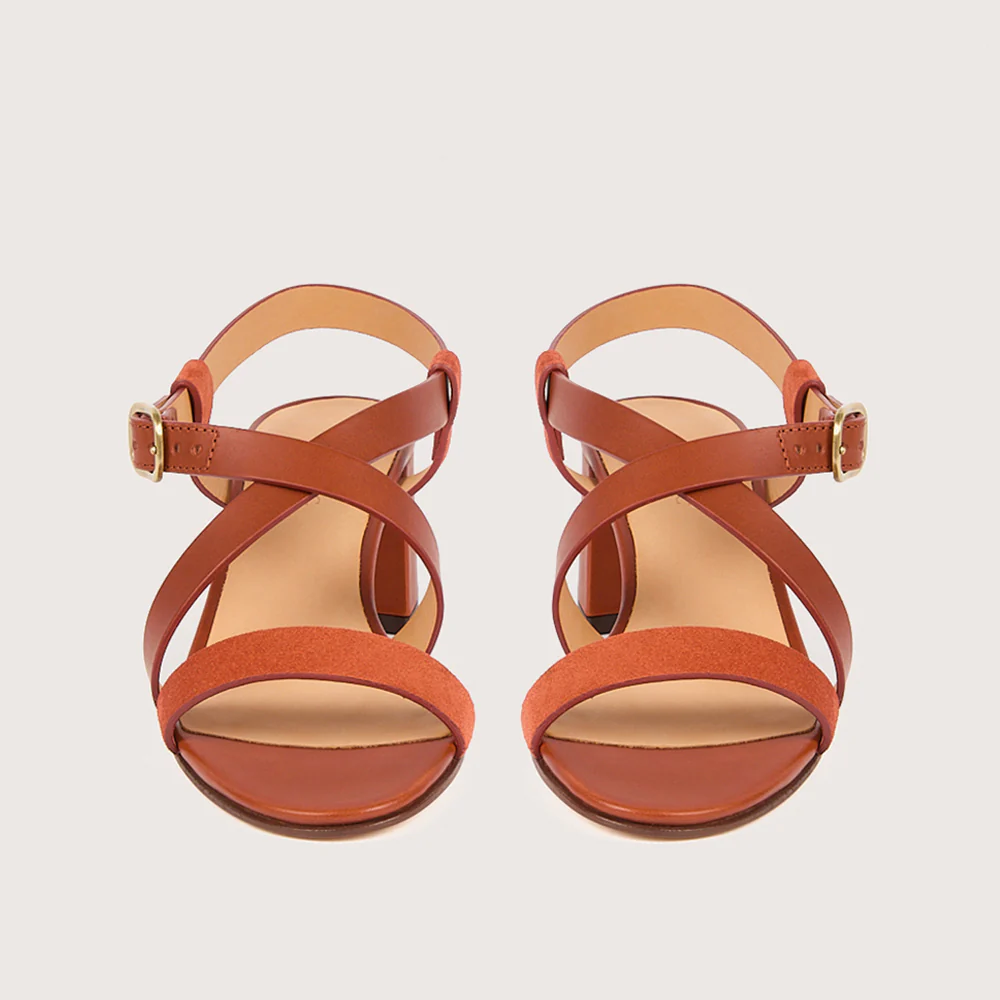 La Sandale à talon Sofia est un modèle de la saison, au profil féminin avec ses brides croisées et sa semelle en cuir. Elle se décline avec une tige en velours, coloris sienne.